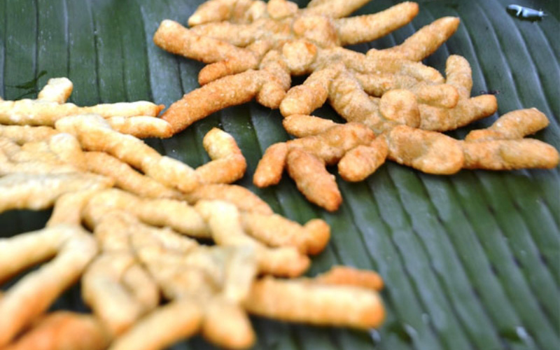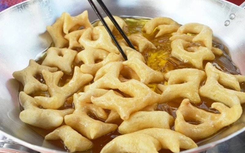Để tạo ra chiếc bánh hoàn hảo, người làm bánh phải tỉ mỉ trộn gạo nếp với trứng gà tươi, nặn thành hình củ gừng rồi chiên vàng giòn trong chảo dầu.