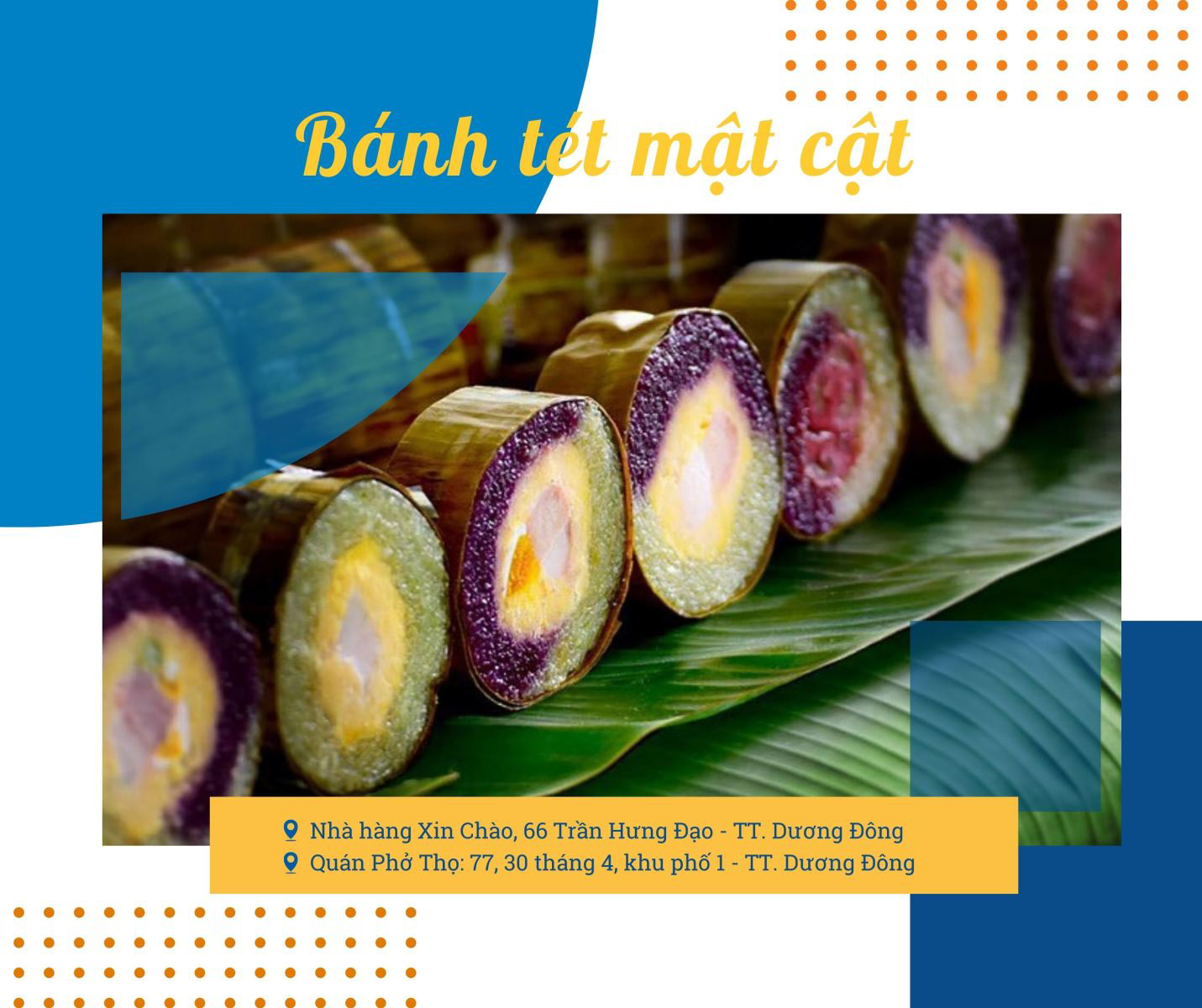 Mua quà mang đậm chất ẩm thực Phú Quốc sau chuyến du lịch thì không gì quý bằng một đòn bánh tét mật cật. Ở Cần Thơ, người ta dùng lá cẩm gói bánh thì ở Phú Quốc dùng lá mật cật. Nhân bánh gồm có gạo nếp loại ngon, đậu xanh, thịt mỡ béo béo và đặt biệt là gạo phải được trộn với nước cốt lá dứa và lá ngót tạo mùi thơm tự nhiên chứ không dùng nước dừa như một số địa phương khác.