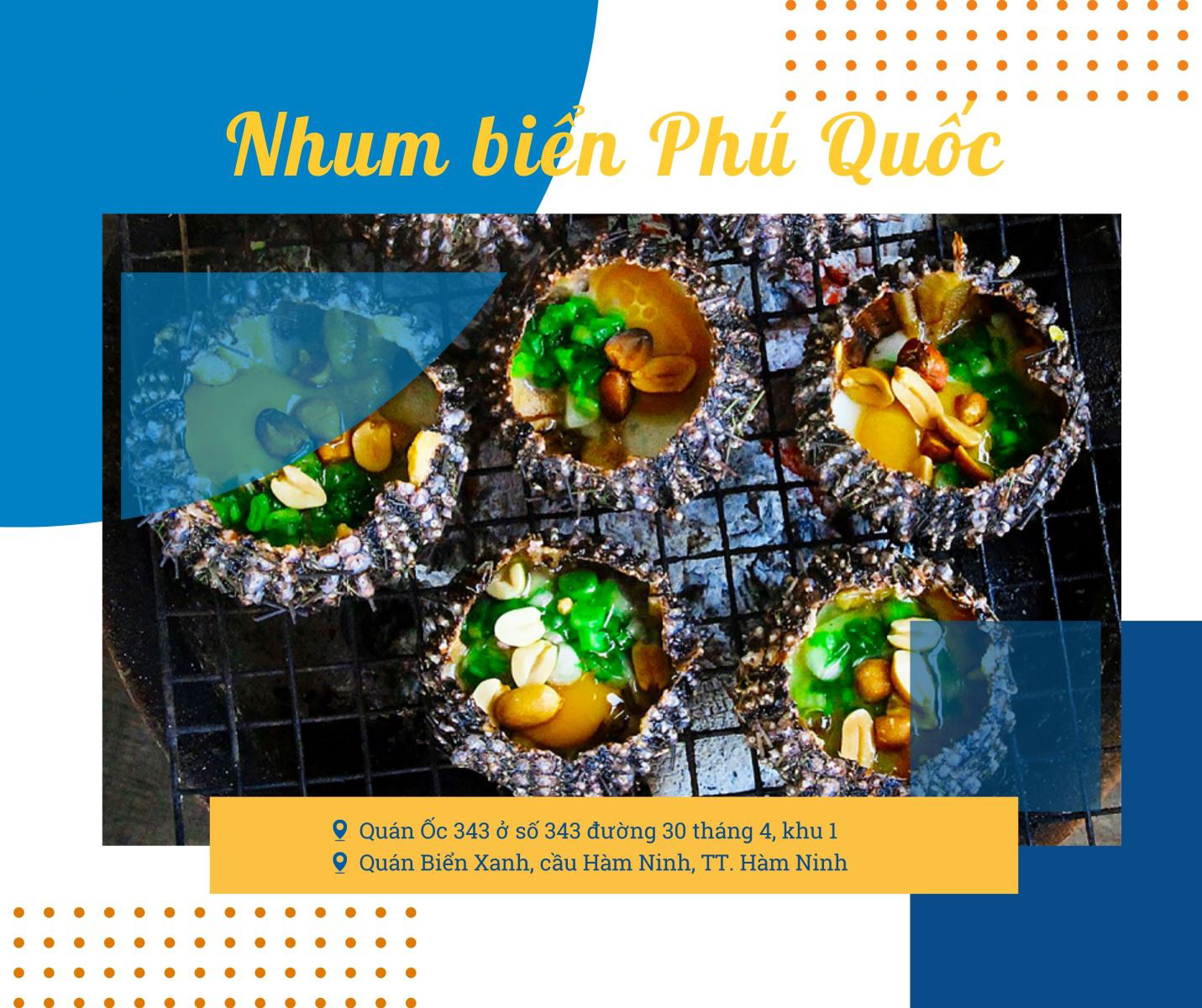 Nhum biển là món ăn được cánh mày râu đặc biệt yêu thích trong hành trình khám phá món ngon đặc sản ẩm thực Phú Quốc. Nhum hay còn gọi là cầu gai thường được nạo thịt nấu cháo, hoặc bổ đôi để nướng và ăn sống tái chanh. Cách phổ biến nhất có lẽ là nhum nướng ăn cùng muối tiêu chanh siêu ngon và bổ dưỡng.