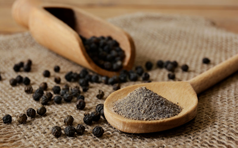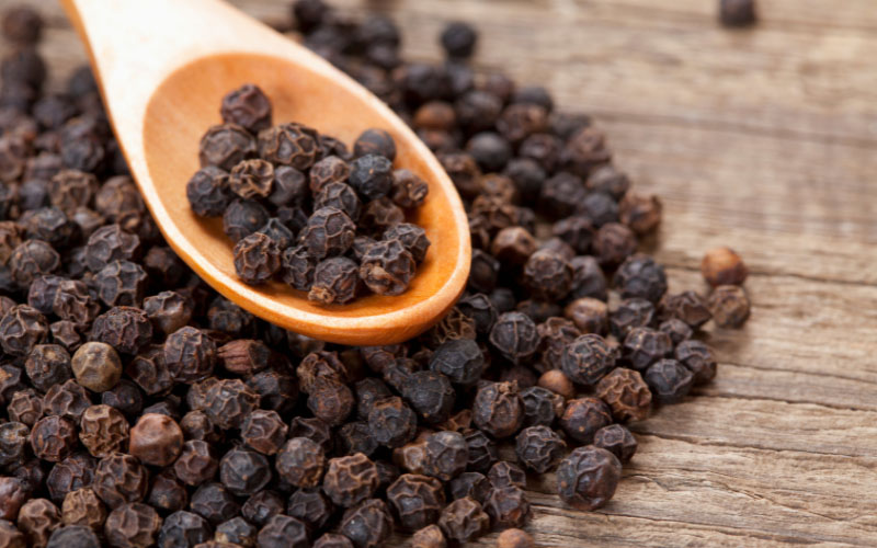 - Tiêu đen : Trái tiêu xanh chưa chín hoặc chín vừa được phơi nắng và sấy khô. Hạt tiêu đen có vị cay vừa, hương thơm dịu và thấm vào món ăn.