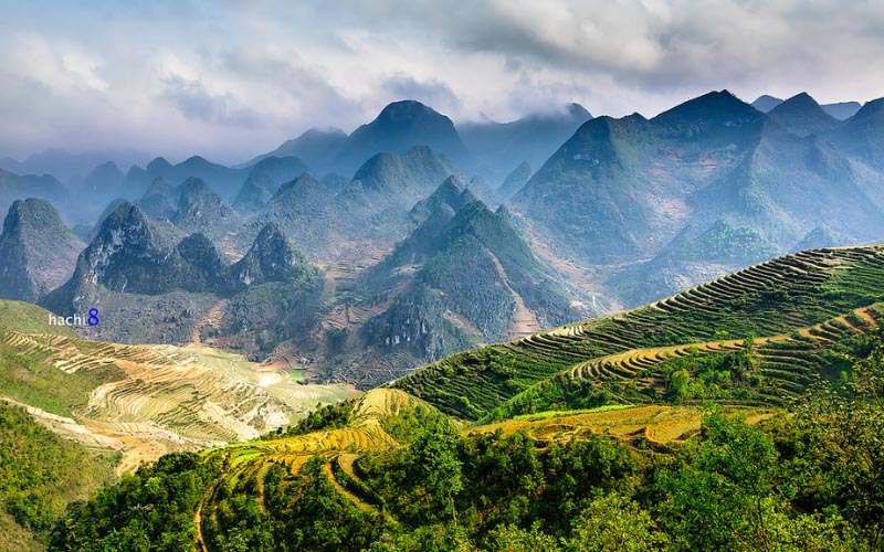 Cao nguyên đá nơi đây nổi tiếng với những dãy núi đá tai mèo xám ngắt, xếp chồng lên nhau tạo nên một khung cảnh hùng vĩ và tráng lệ. Đan xen giữa những dãy núi đá là thửa ruộng bậc thang xanh mướt, những nương ngô, nương lúa vàng óng, tạo nên một bức tranh thiên nhiên vô cùng ấn tượng.