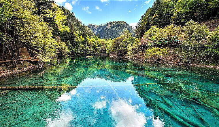 Hồ Ngũ Hoa là một hồ nước nhiều màu cạn, dưới đáy là những thân cây cổ đổ nát.