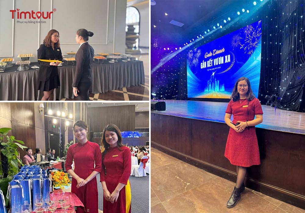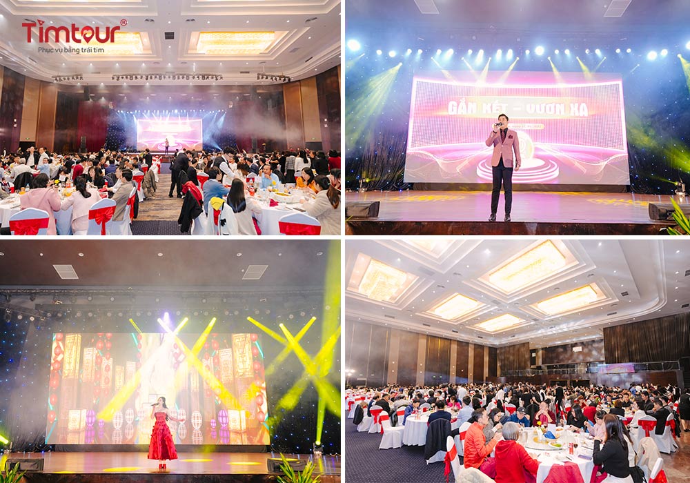 Ngay buổi tối cùng ngày, Gala Dinner diễn ra trong không khí trang trọng và ấm cúng. Đội ngũ nhân sự Timtour đã làm việc khẩn trương, chuẩn bị hậu cần và chỉn chu từ MC, backdrop check-in cho khách mời đến menu tiệc, đảm bảo chất lượng và an toàn vệ sinh thực phẩm. Các tiết mục biểu diễn hấp dẫn của các ca sĩ và vũ công chuyên nghiệp trong khuôn khổ chương trình Gala Dinner đã làm nóng bầu không khí. Khách mời cũng được dịp thể hiện tài năng ca hát của mình trong chương trình âm nhạc tự do.
