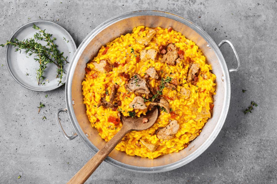 Saffron risotto không chỉ là một món ăn, mà còn là một tác phẩm nghệ thuật ẩm thực. Hạt gạo Ý Arborio được lựa chọn kỹ càng, khi nấu sẽ trở nên mềm dẻo, thấm đẫm hương vị của nghệ tây một loại gia vị đắt đỏ và quý hiếm.