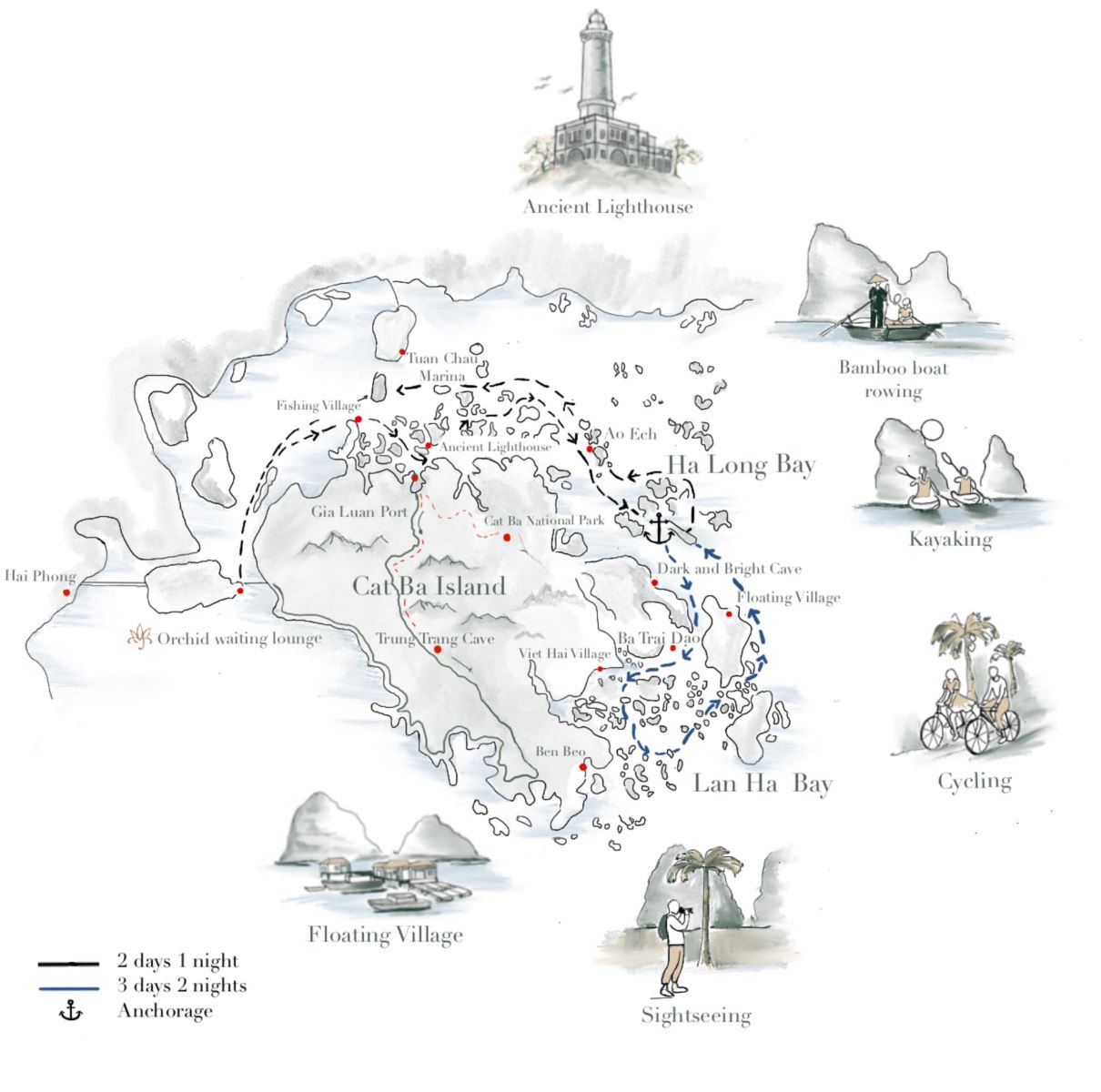 17:00 Orchid di chuyển tới Trà Báu, một khu vực còn nhiều hoang sơ trên Vịnh Lan Hạ. Tại đây, Quý khách sẽ được thoả thích hoà mình vào làn nước trong xanh màu ngọc bích.